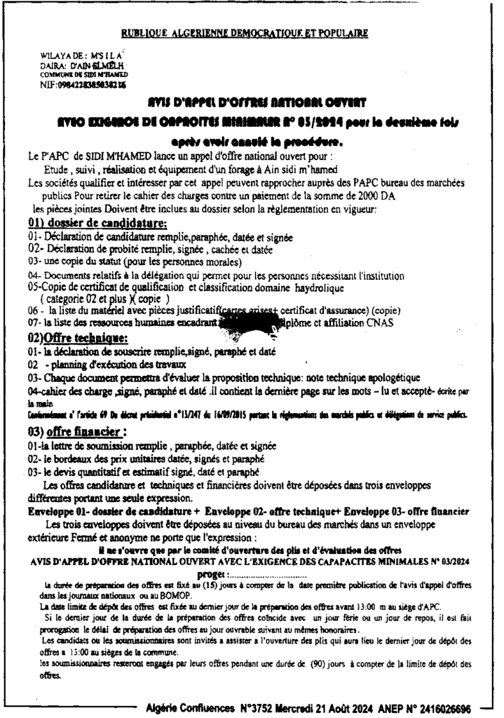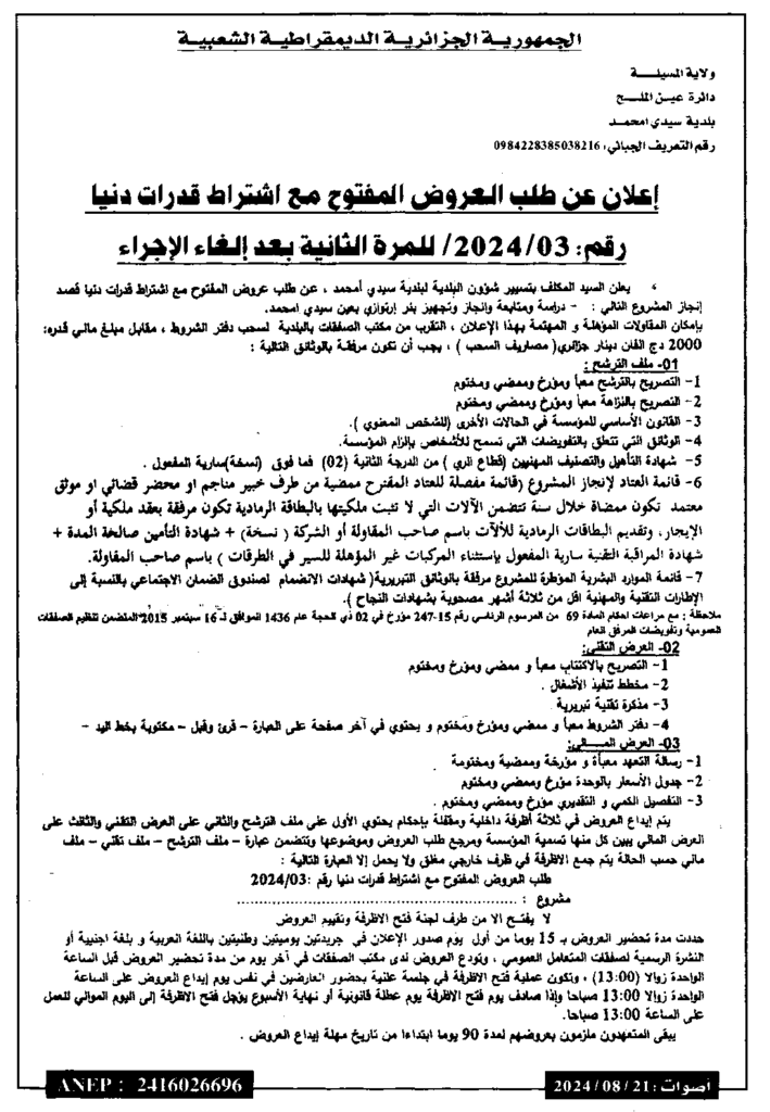 إعلان عن طلب العروض المفتوح 2024/03 للمرة الثانية بعد إلغاء الاجراء/ بلدية سيدي امحمد