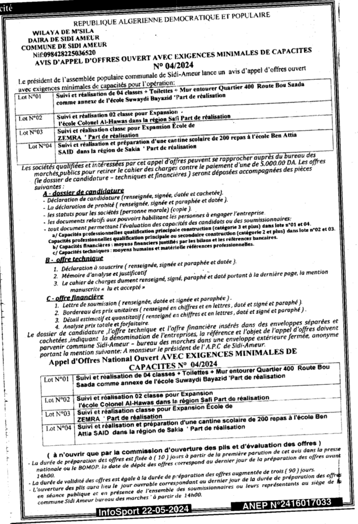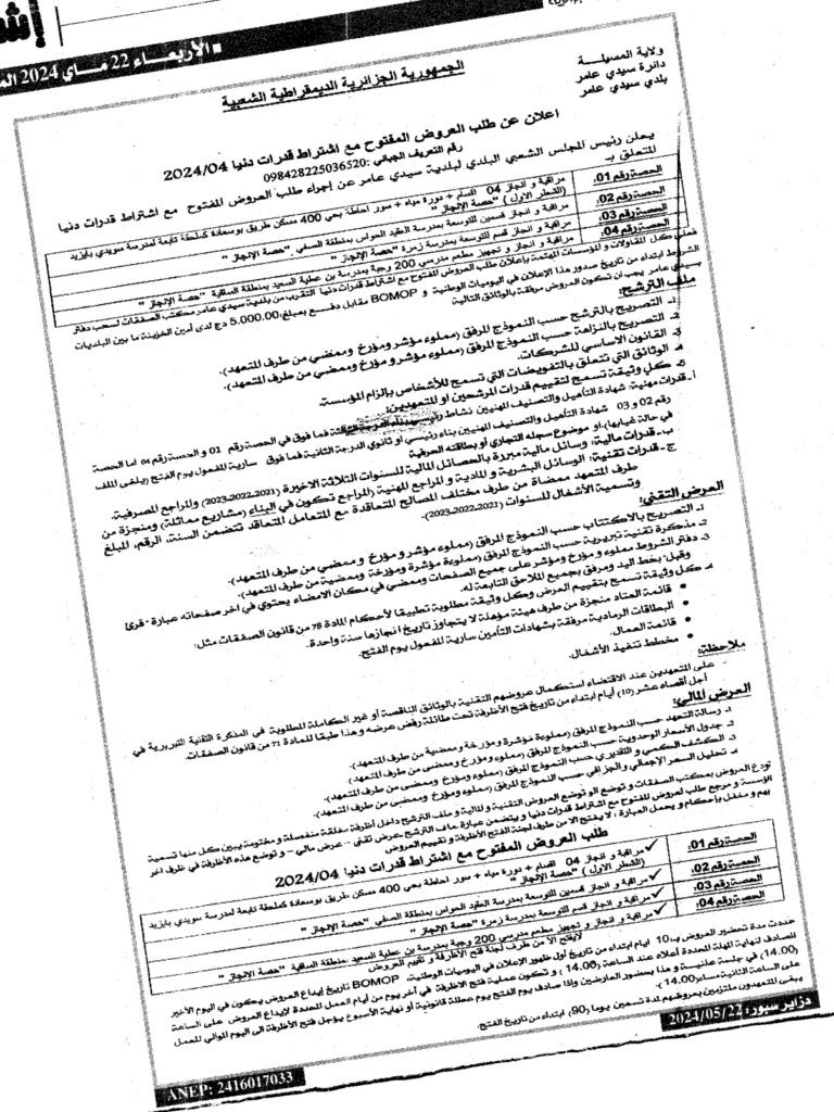 إعلان عن طلب العروض المفتوح 2024/04 بلدية سيدي عامر
