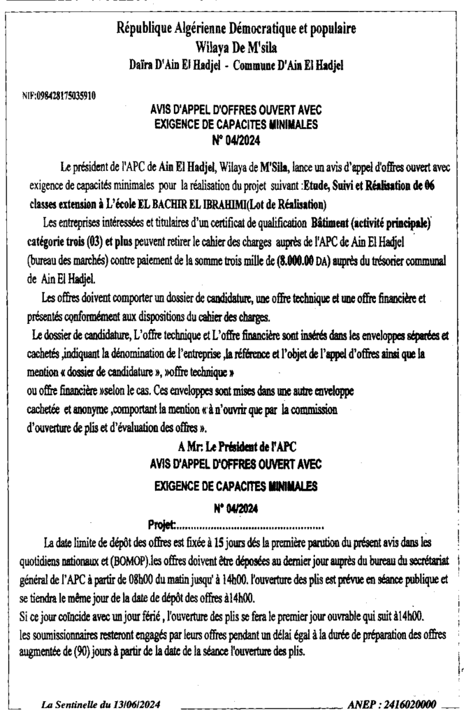 إعلان عن طلب العروض المفتوح 2024/04 بلدية عين الحجل