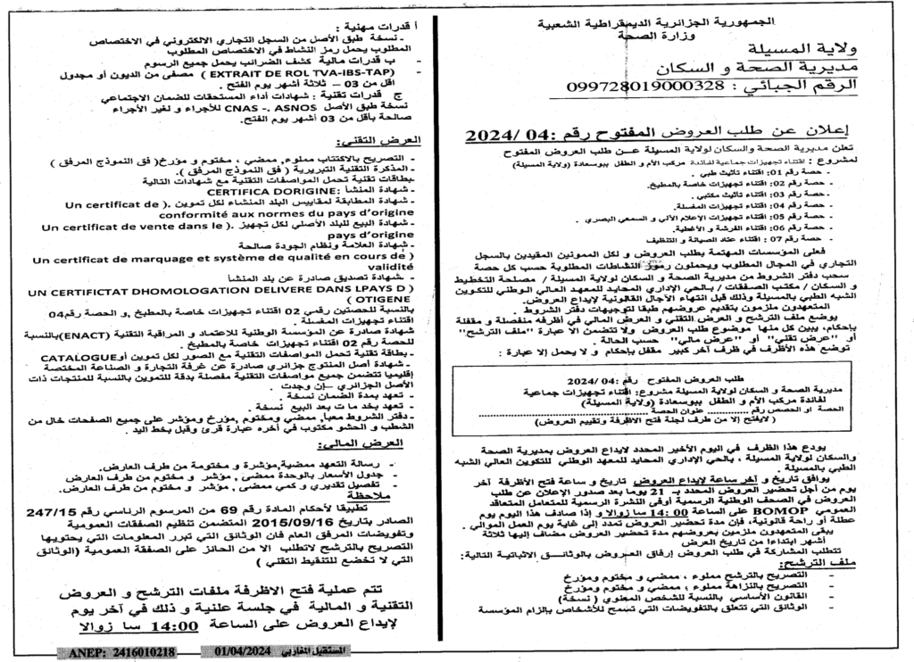 إعلان عن طلب العروض المفتوح 2024/04 مديرية الصحة والسكان لولاية المسيلة