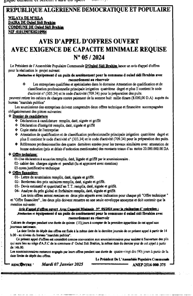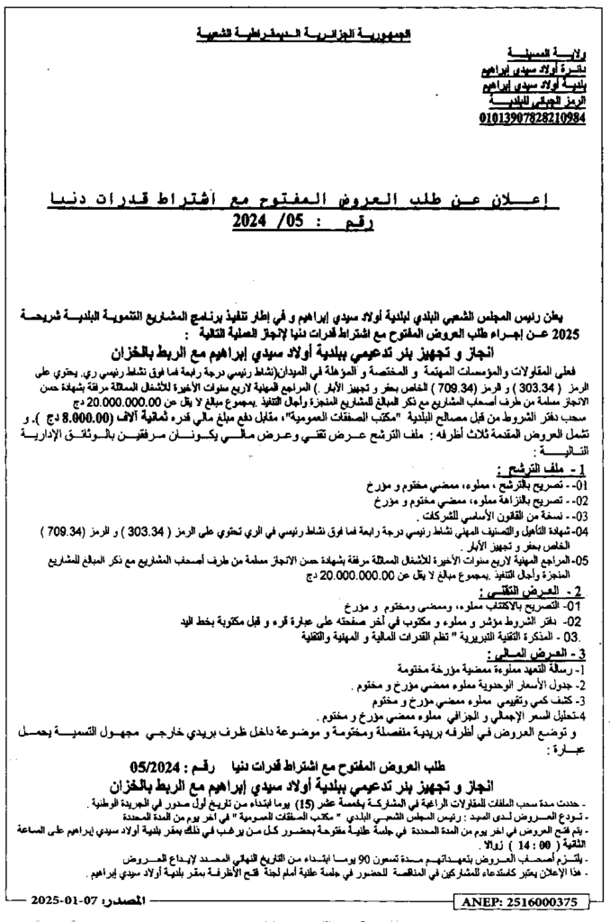 إعلان عن طلب العروض المفتوح 2024/05 بلدية أولاد سيدي ابراهيم