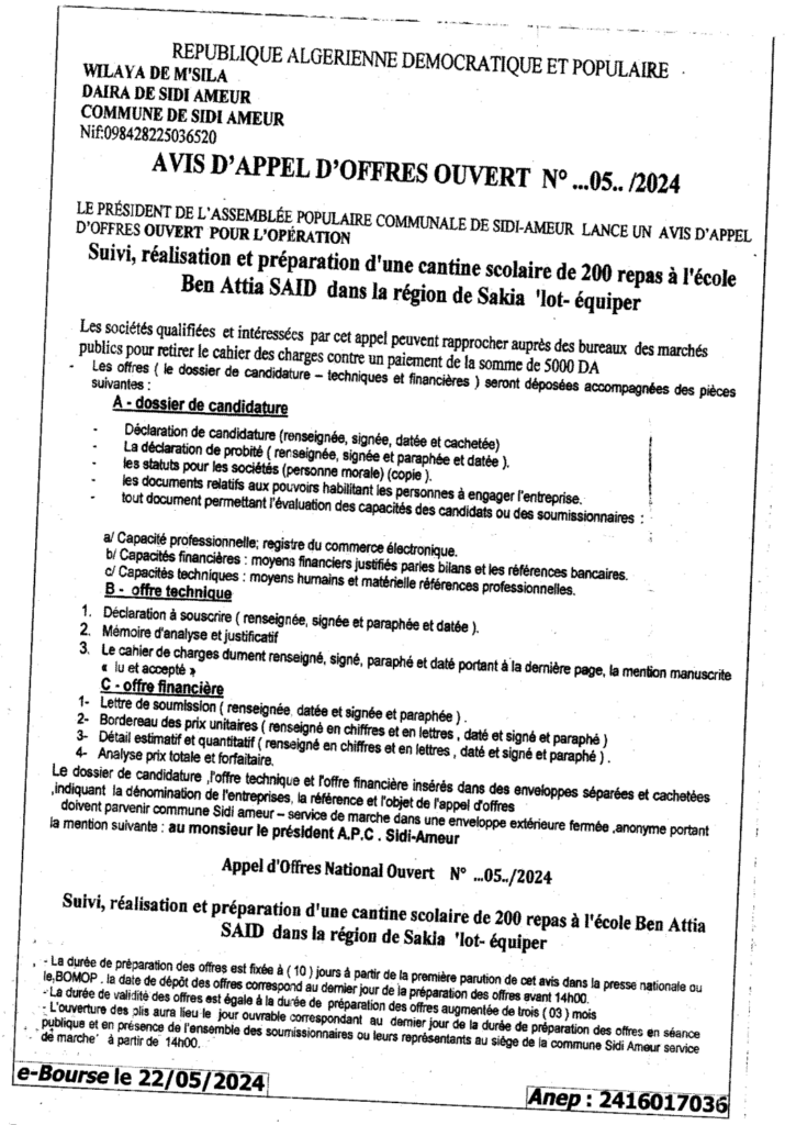 إعلان عن طلب العروض المفتوح 2024/05 بلدية سيدي عامر