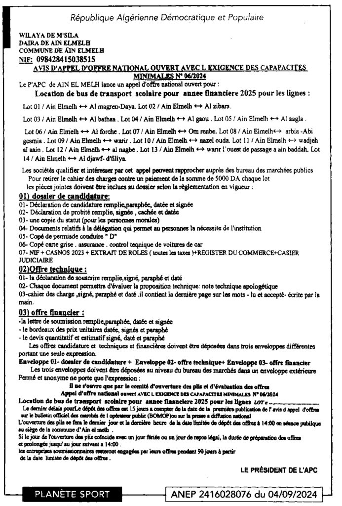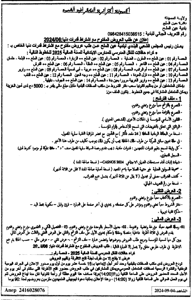 إعلان عن طلب العروض المفتوح 2024/06 بلدية عين الملح