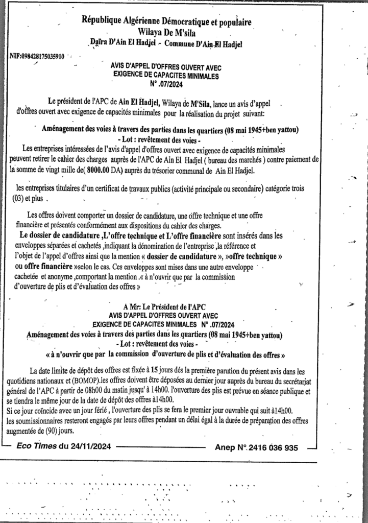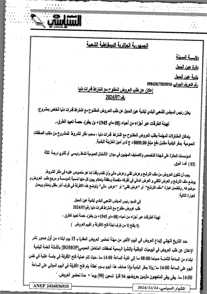 إعلان عن طلب العروض المفتوح 2024/07 بلدية عين الحجل