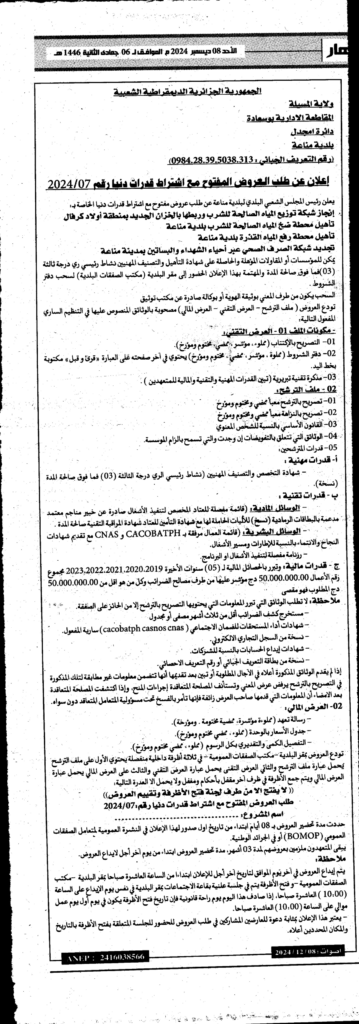 إعلان عن طلب العروض المفتوح 2024/07 بلدية مناعة