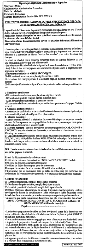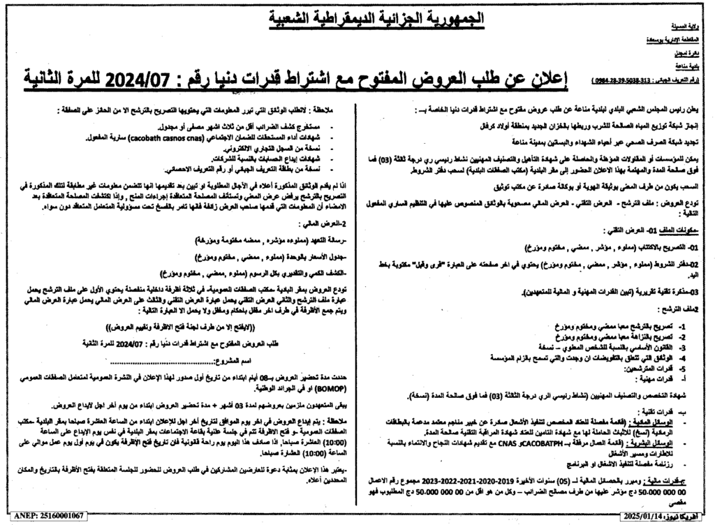 إعلان عن طلب العروض المفتوح 2024/07 للمرة الثانية/ بلدية مناعة