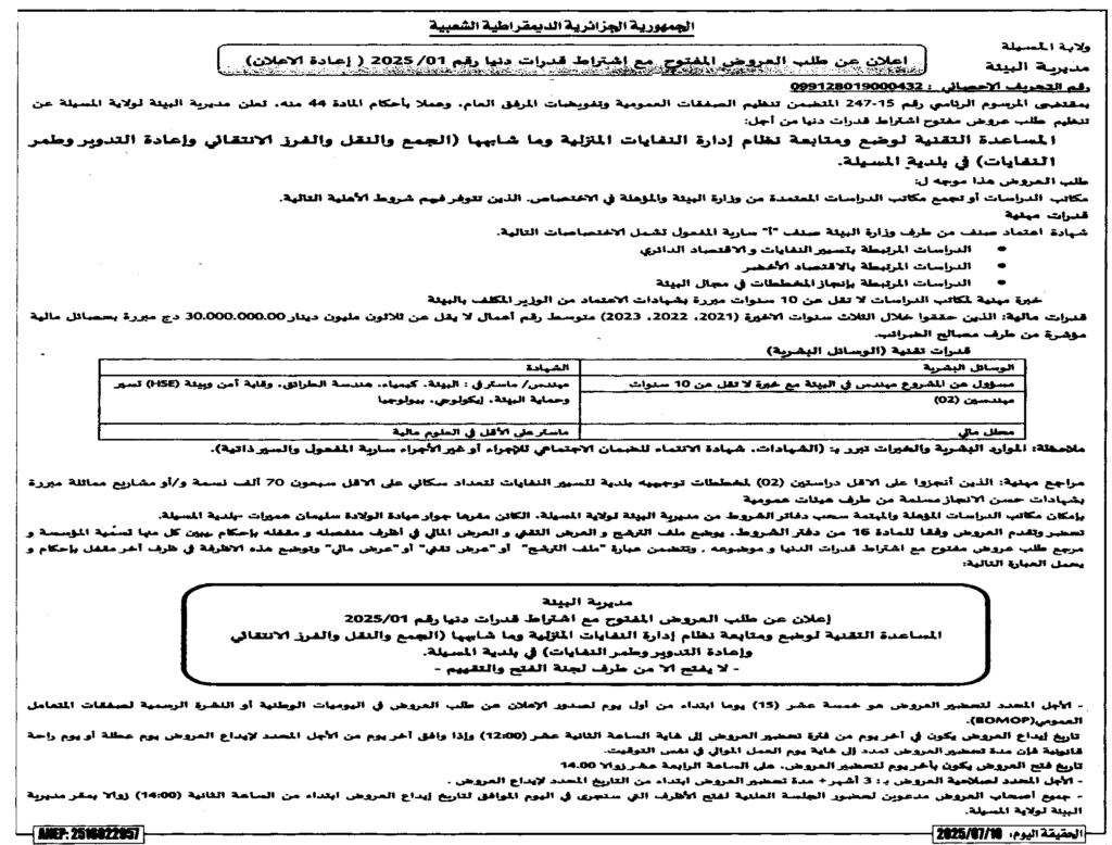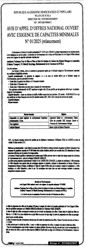 إعلان عن طلب العروض المفتوح 2025/01 (إعادة الاعلان)/ مديرية البيئة لولاية المسيلة