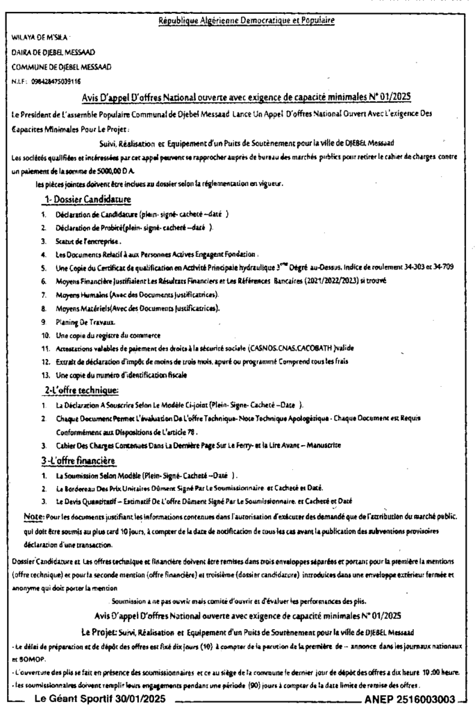 إعلان عن طلب العروض المفتوح 2025/01 بلدية جبل امساعد