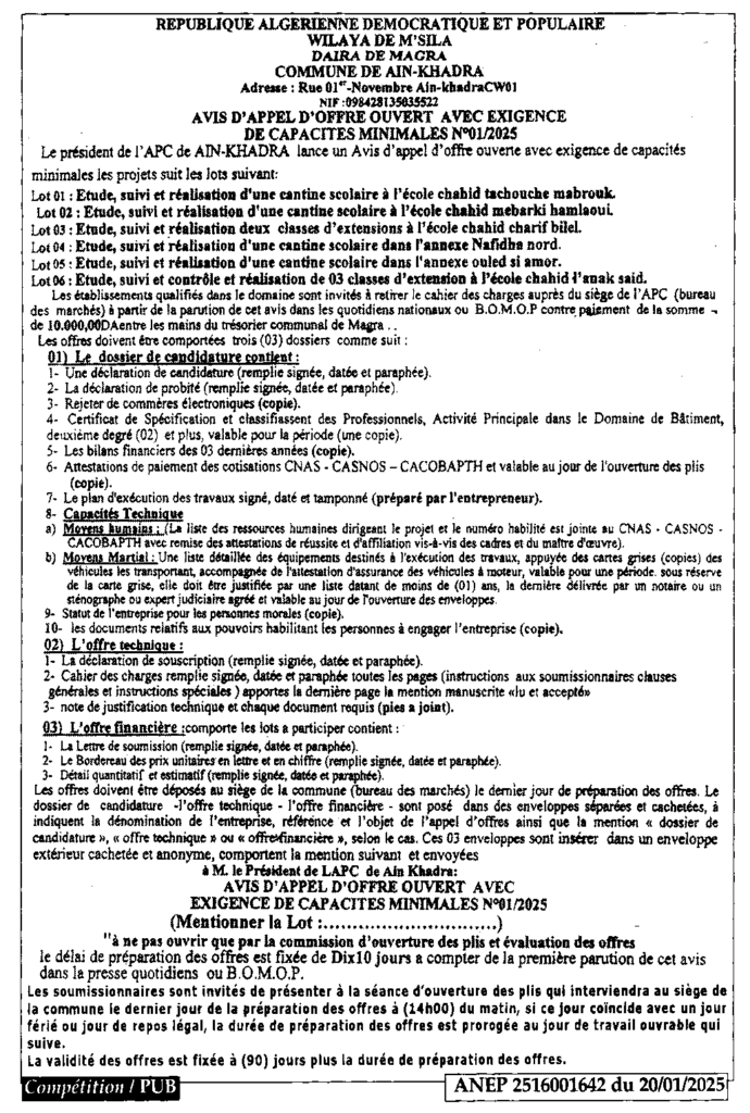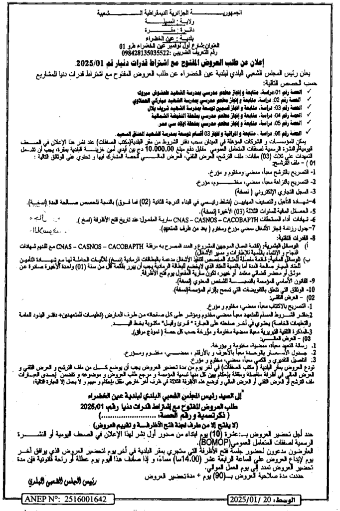 إعلان عن طلب العروض المفتوح 2025/01 بلدية عين الخضراء