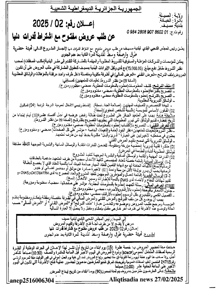 إعلان عن طلب العروض المفتوح 2025/02 بلدية مسيف