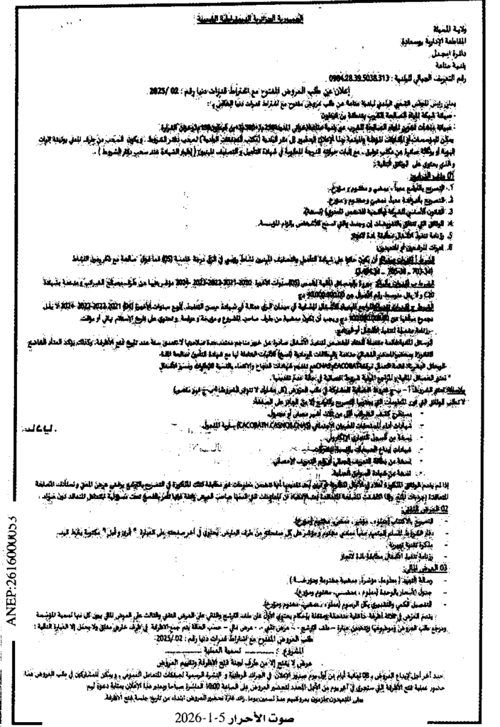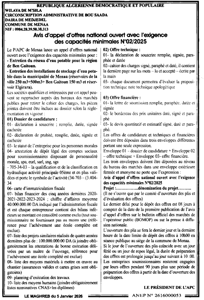 إعلان عن طلب العروض المفتوح 2025/02 بلدية مناعة