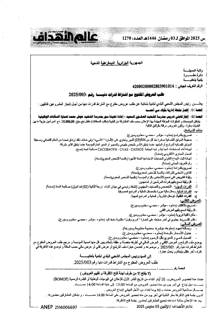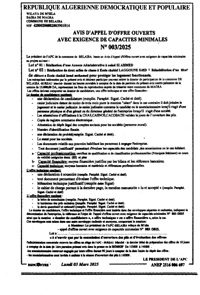 إعلان عن طلب العروض المفتوح 2025/03 بلدية بلعايبة