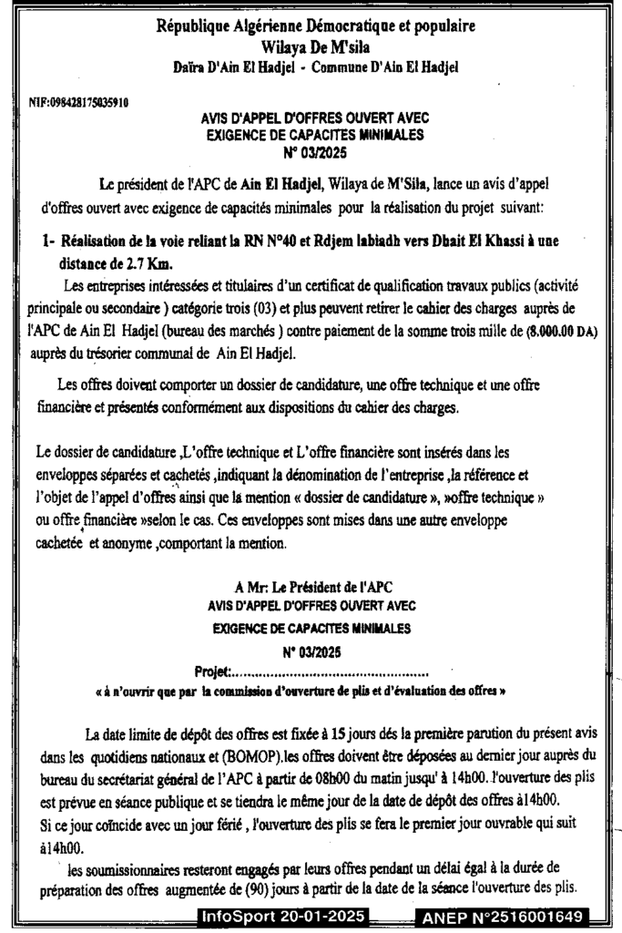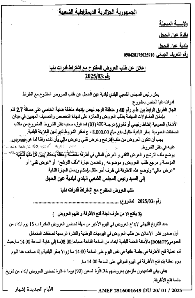 إعلان عن طلب العروض المفتوح 2025/03 بلدية عين الحجل