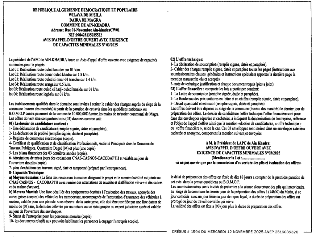 إعلان عن طلب العروض المفتوح 2025/03 بلدية عين الخضراء
