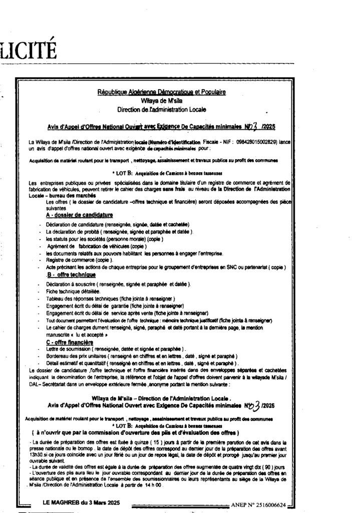 إعلان عن طلب العروض المفتوح 2025/03 مديرية الإدارة المحلية لولاية المسيلة