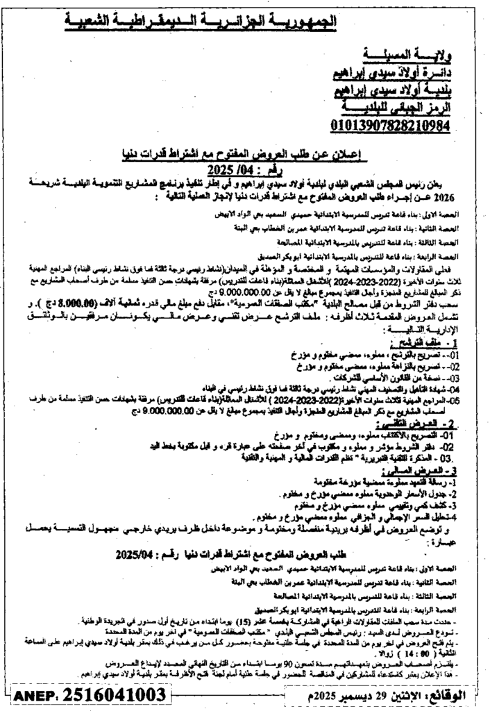 إعلان عن طلب العروض المفتوح 2025/04 بلدية أولاد سيدي ابراهيم