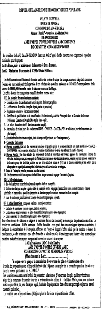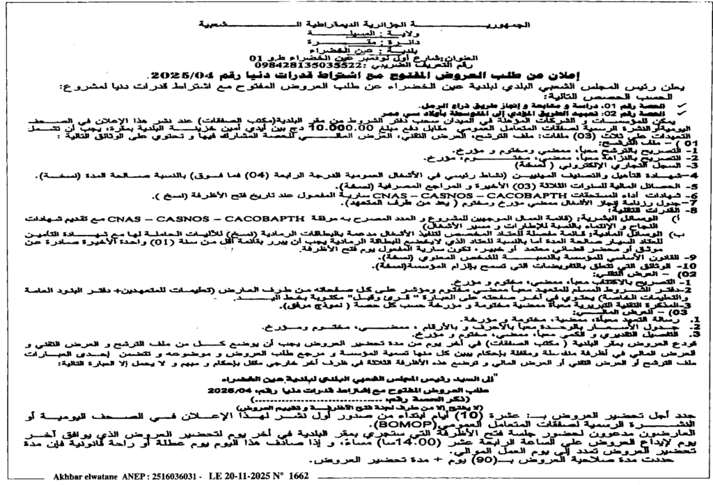 إعلان عن طلب العروض المفتوح 2025/04 بلدية عين الخضراء