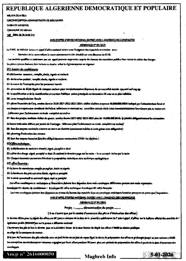 إعلان عن طلب العروض المفتوح 2025/04 بلدية مناعة