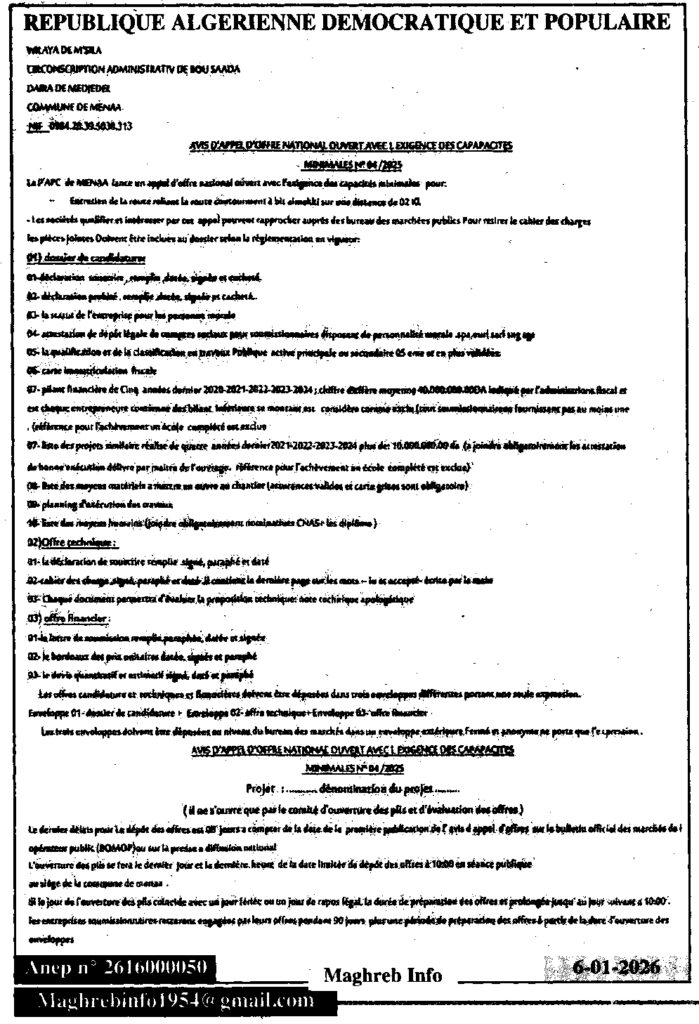 إعلان عن طلب العروض المفتوح 2025/04 بلدية مناعة