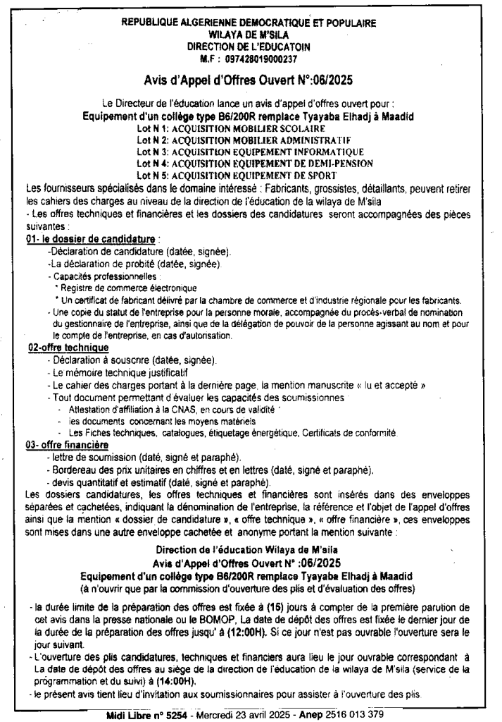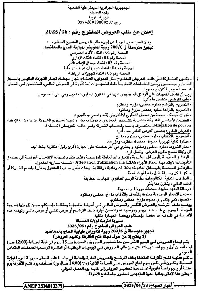 تجهيز متوسطة نمط (ق 200/6) وجبة لتعويض طيايبة الحاج بالمعاضيد23 أبريل، 20250 29 شاركها فيسبوك X مشاركة عبر البريد طباعة