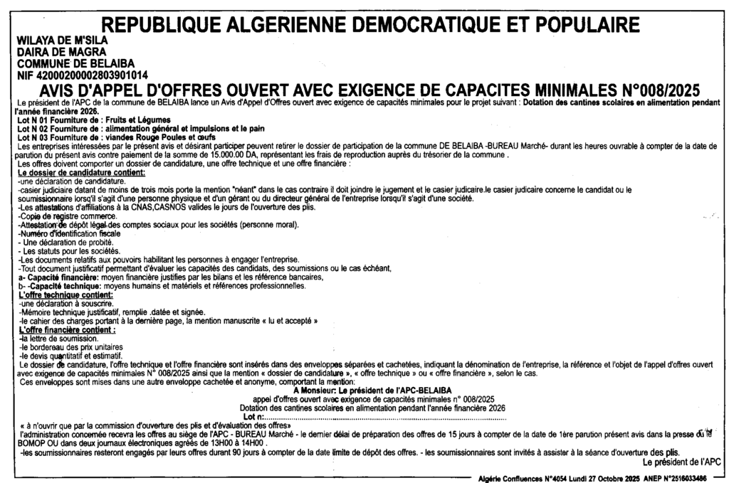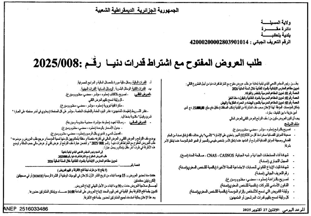 إعلان عن طلب العروض المفتوح 2025/08 بلدية بلعايبة