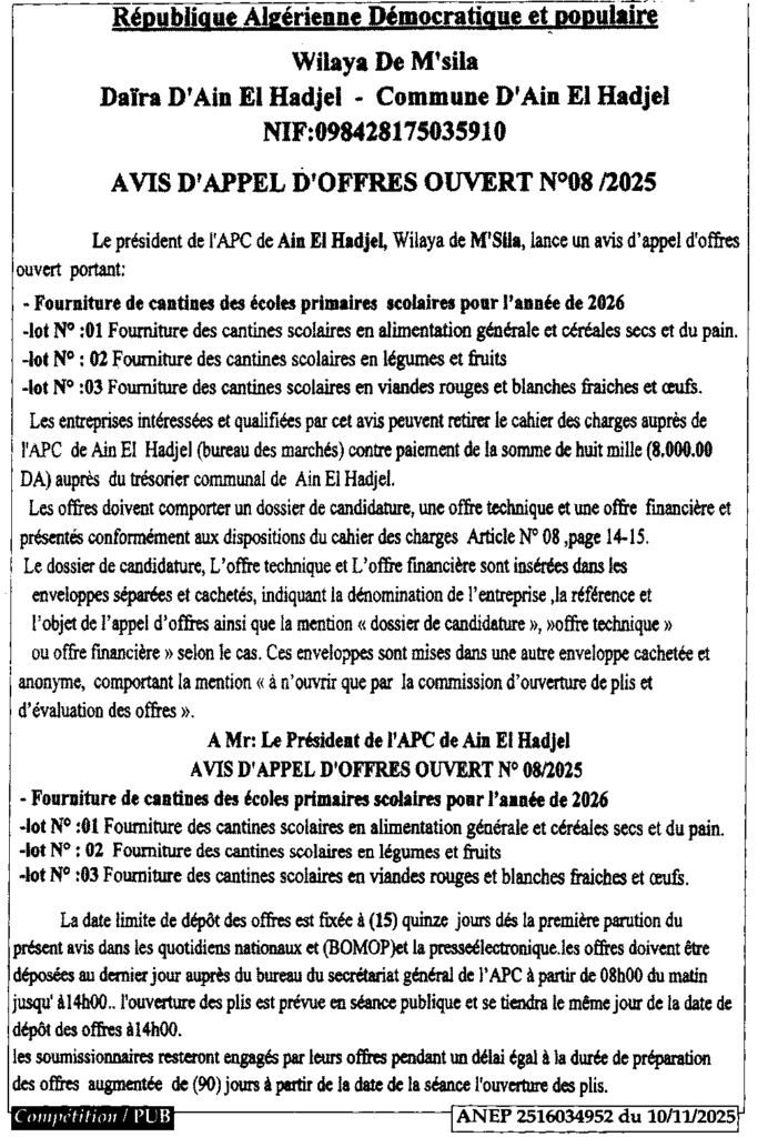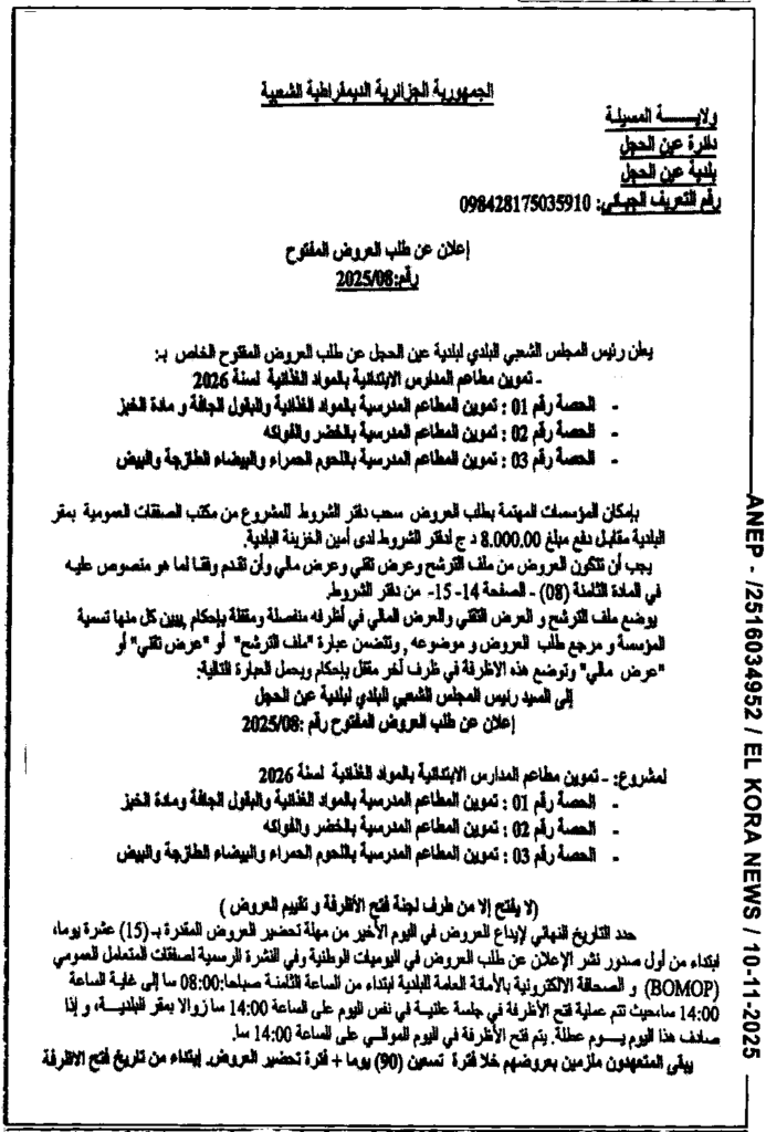 إعلان عن طلب العروض المفتوح 2025/08 بلدية عين الحجل