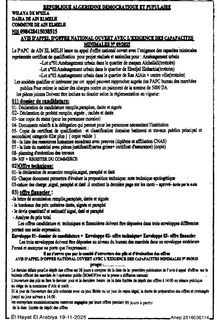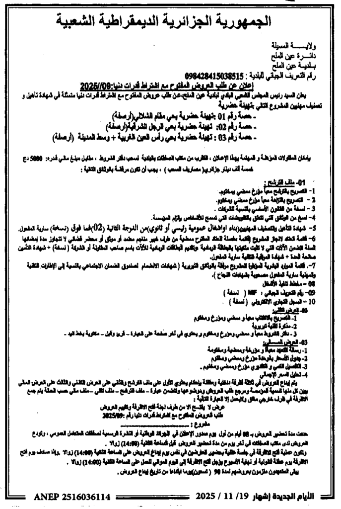 إعلان عن طلب العروض المفتوح 2025/09 بلدية عين الملح