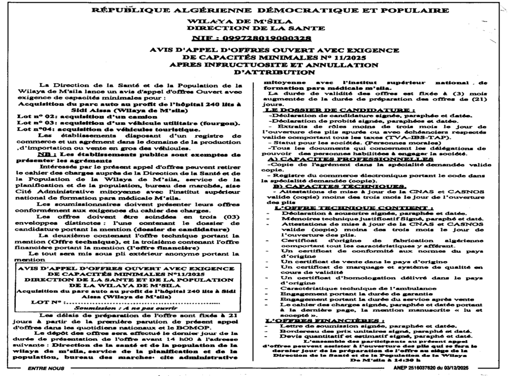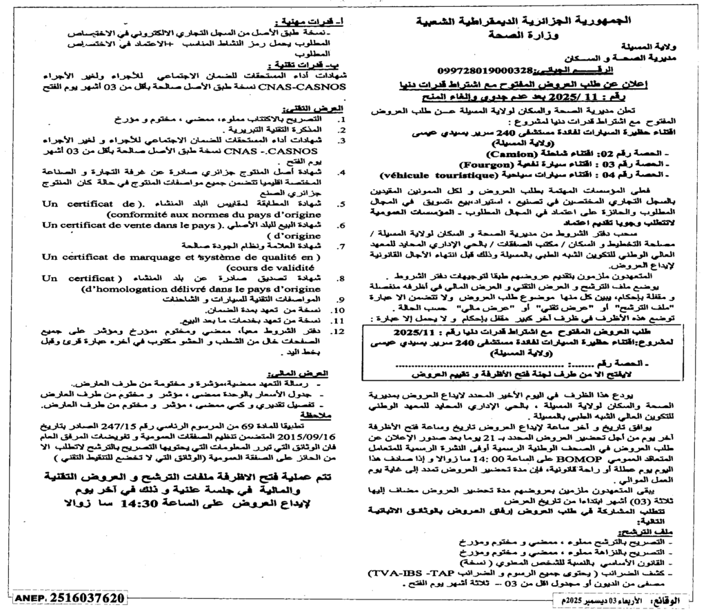 إعلان عن طلب العروض المفتوح 2025/11 بعد عدم جدوى وإلغاء المنح/ مديرية الصحة والسكان لولاية المسيلة