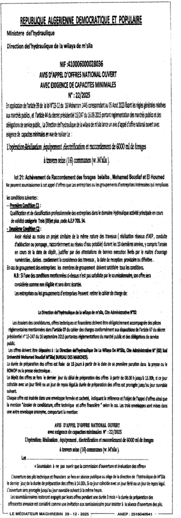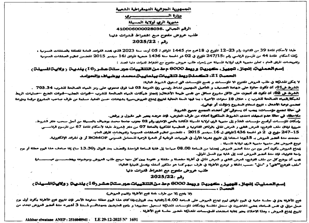 إعلان عن طلب العروض المفتوح 2025/22 مديرية الري لولاية المسيلة