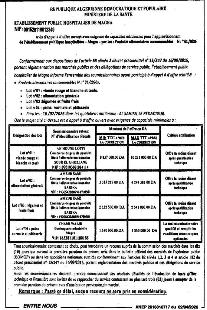 إعلان عن طلب العروض المفتوح 2026/01 المؤسسة العمومية الاستشفائية لمقرة