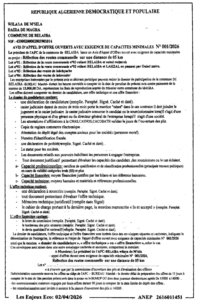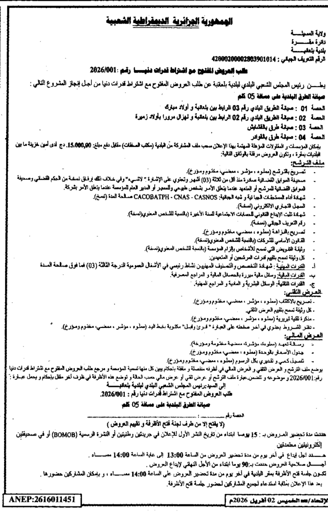 إعلان عن طلب العروض المفتوح 2026/01 بلدية بلعايبة