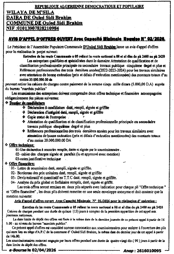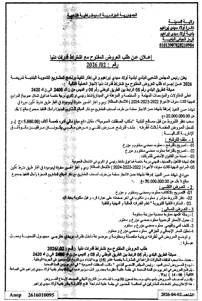 إعلان عن طلب العروض المفتوح 2026/02 بلدية أولاد سيدي ابراهيم