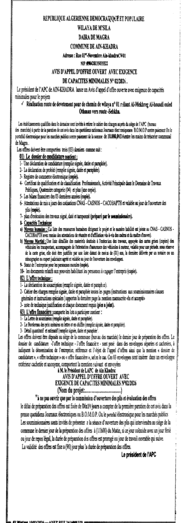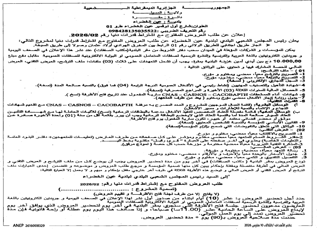 إعلان عن طلب العروض المفتوح 2026/02 بلدية عين الخضراء