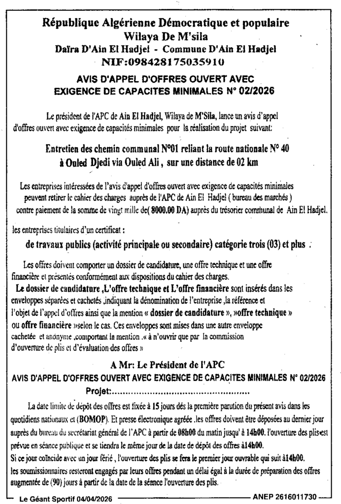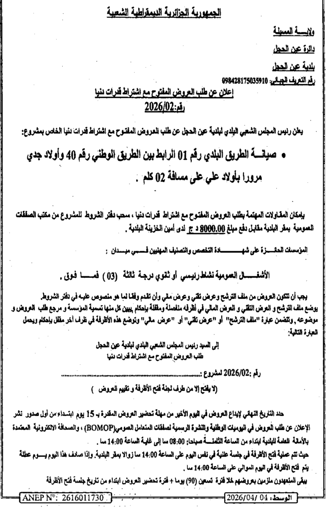 إعلان عن طلب العروض المفتوح 2026/02 بلدية عين الحجل