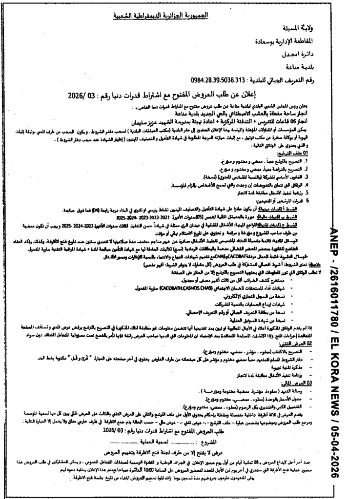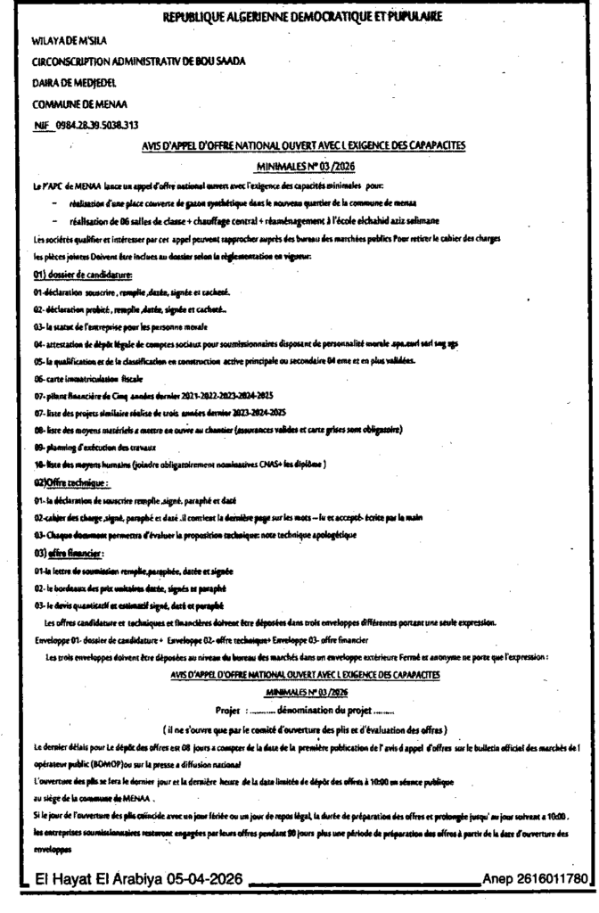 إعلان عن طلب العروض المفتوح 2026/03 بلدية مناعة