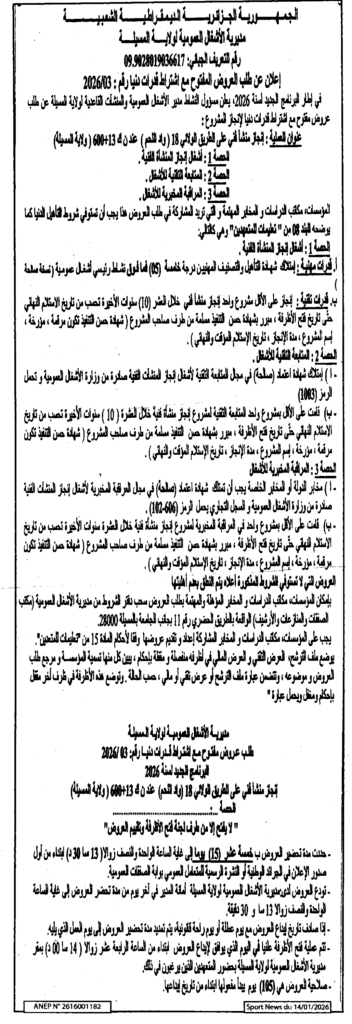 إعلان عن طلب العروض المفتوح 2026/03 مديرية الأشغال العمومية لولاية المسيلة