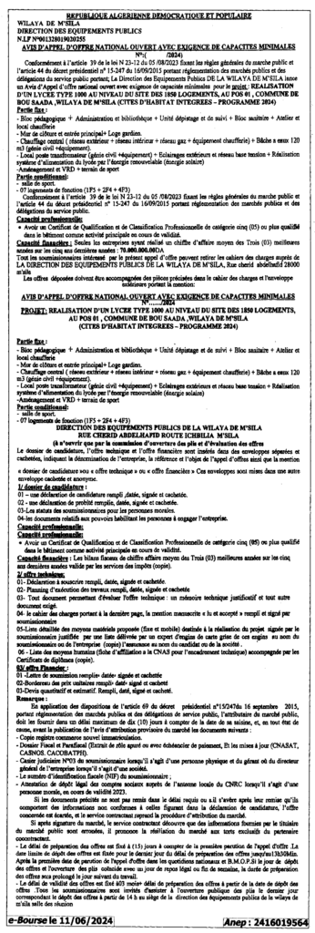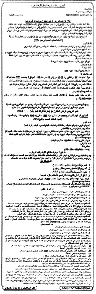 إعلان عن طلب العروض الوطني المفتوح: انجاز ثانوية نوع 1000 على مستوى موقع 1850 مسكن 01 POS بلدية بوسعادة/ مديرية التجهيزات العمومية لولاية المسيلة