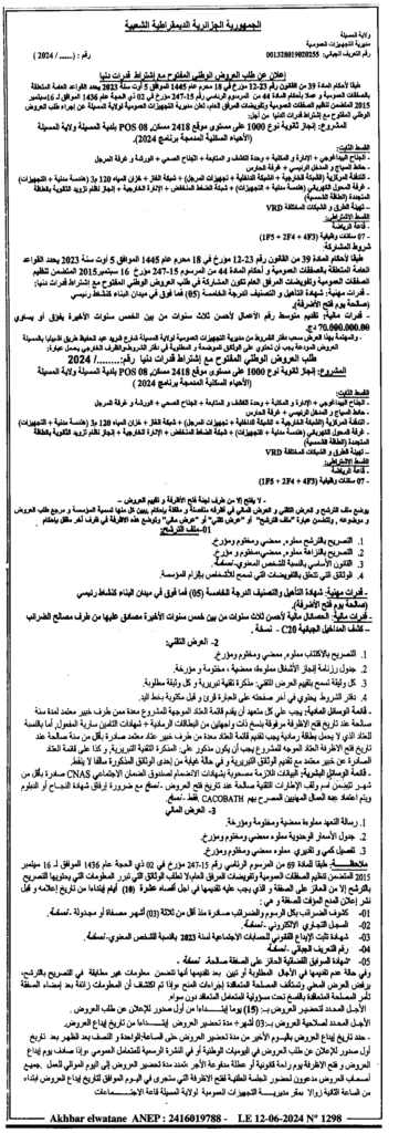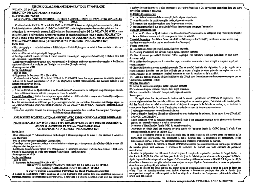 إعلان عن طلب العروض الوطني المفتوح: انجاز ثانوية نوع 1000 على مستوى موقع 2418 مسكن 08 POS بلدية المسيلة/ مديرية التجهيزات العمومية لولاية المسيلة