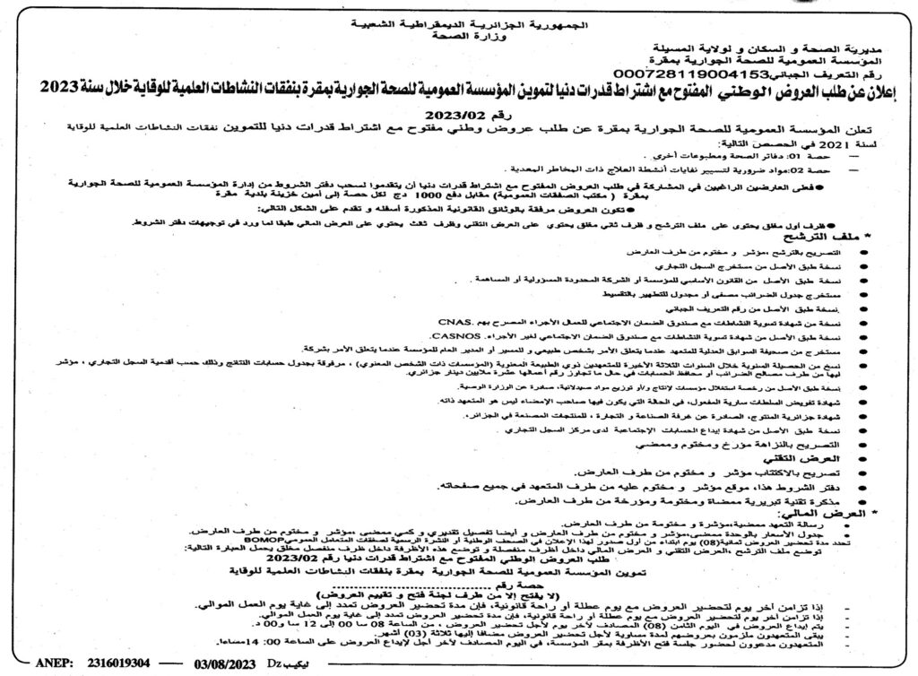 إعلان عن طلب العروض الوطني 2023/02 لتموين المؤسسة العمومية للصحة الجوارية بمقرة بنفقات النشاطات العلمية للوقاية خلال سنة 2023