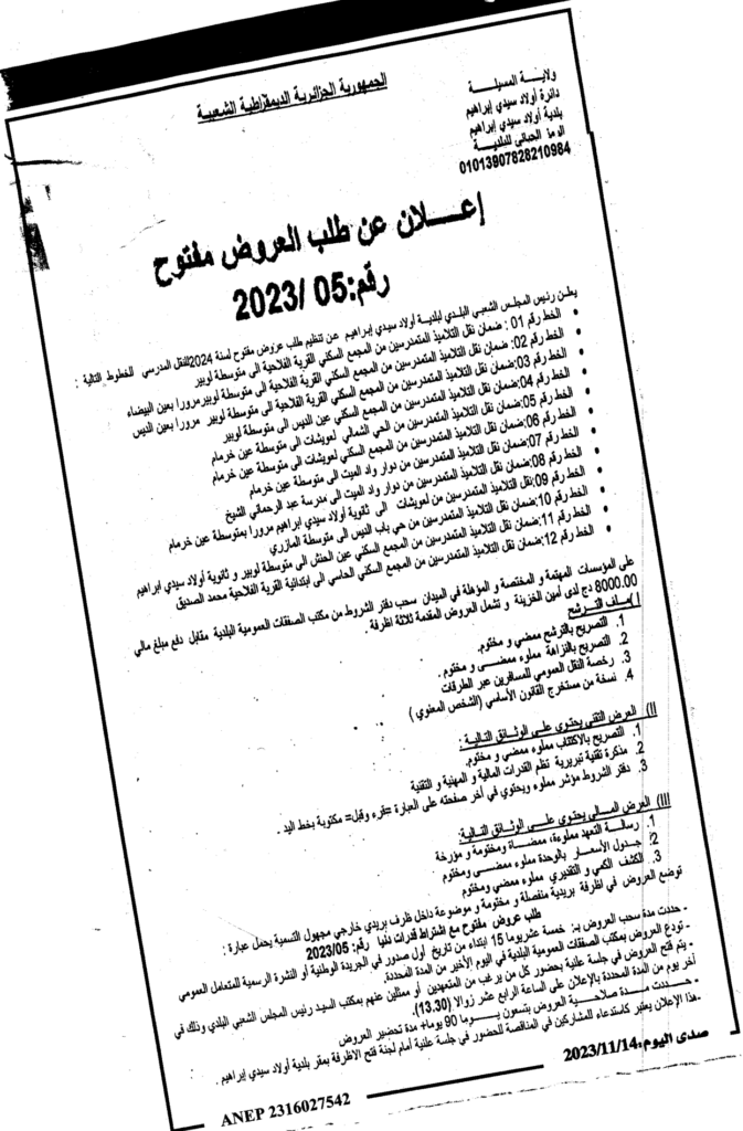 إعلان عن طلب العروض مفتوح 2023/05 بلدية أولاد سيدي ابراهيم