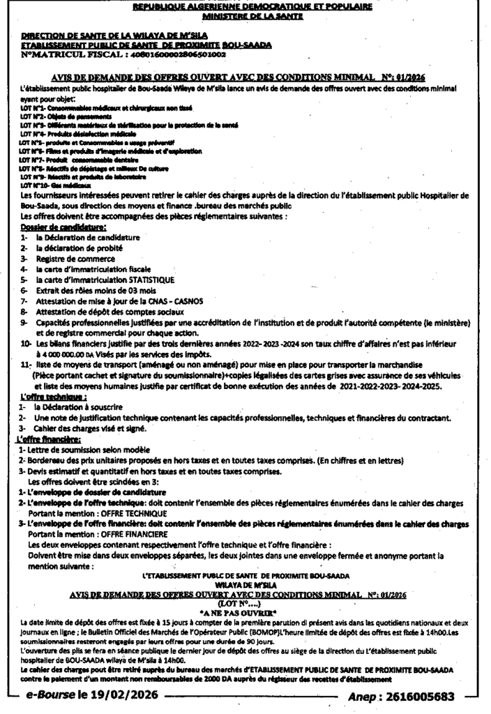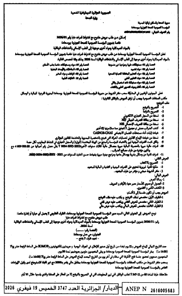 إعلان عن طلب العروض مفتوح 2026/01 المؤسسة العمومية للصحة الجوارية بوسعادة