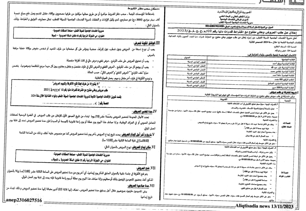 إعلان عن طلب العروض وطني مفتوح 02/م.خ.ج.م.ق/2023 مديرية الخدمات الجامعية