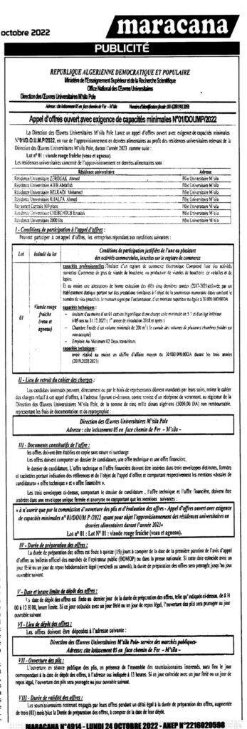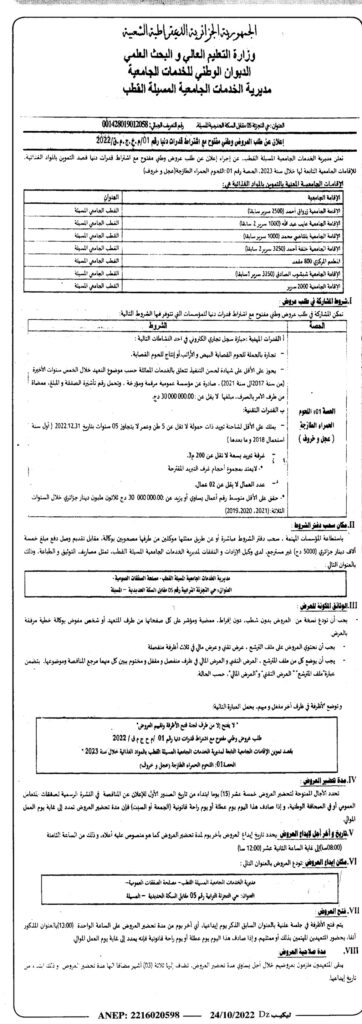 إعلان عن طلب العروض وطني مفتوح 2022/01 مديرية الخدمات الجامعية المسيلة القطب