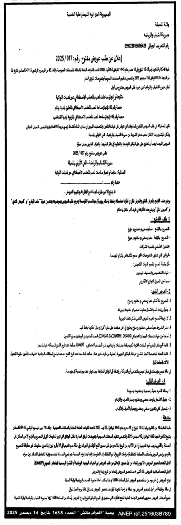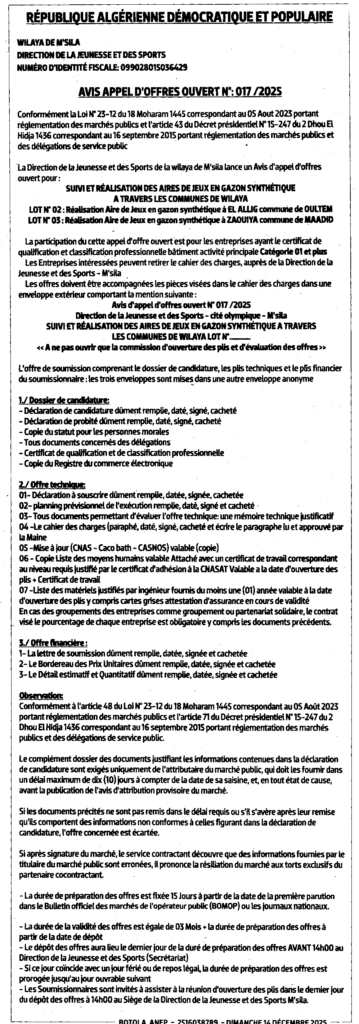 إعلان عن طلب العروض 2025/17 مديرية الشباب والرياضة لوةلاية المسيلة