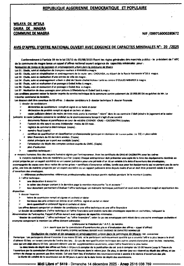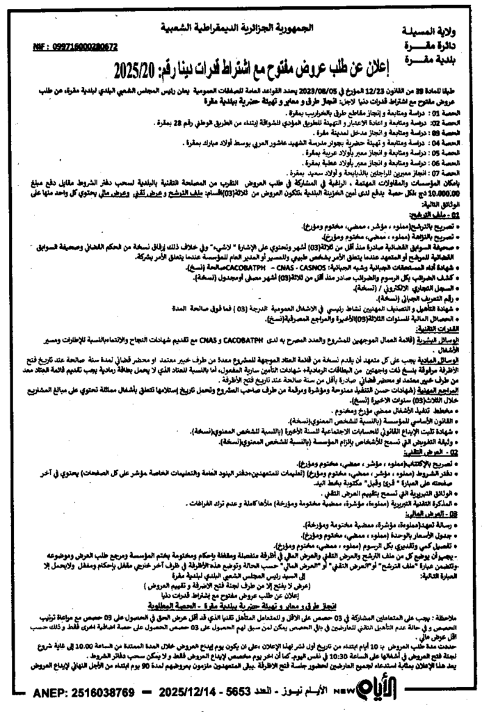 إعلان عن طلب العروض 2025/20 بلدية مقرة