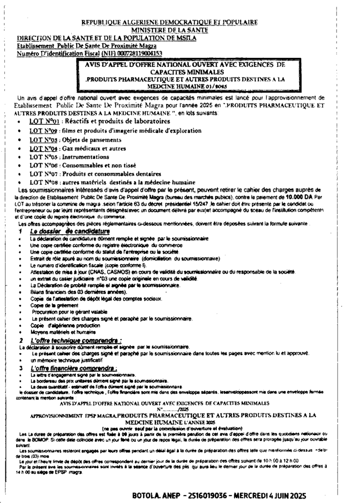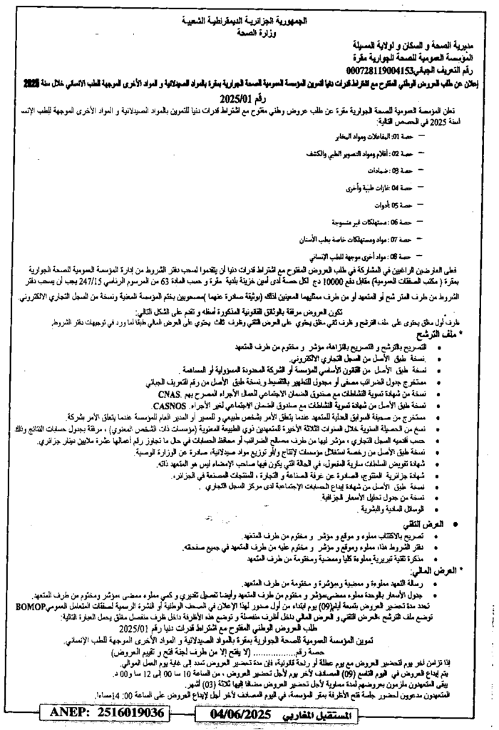 إعلان عن طلب عروض الوطني المفتوح 2025/01 لتموين المؤسسة العمومية للصحة الجوارية بمقرة بمواد الصيدلانية والمواد الأخرى الموجهة للطب الانساني سنة 2025