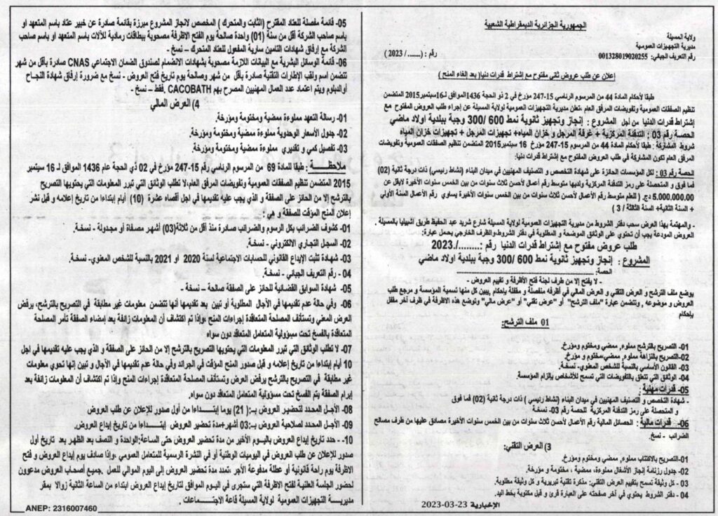 إعلان عن طلب عروض ثاني (بعد إلغاء المنح)/ مديرية التجهيزات العمومية لولاية المسيلة