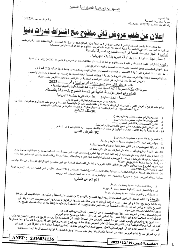 إعلان عن طلب عروض ثاني مفتوح: انجاز مستودع + ربط غرفة التبريد بالشبكة الكهربائية/ مديرية التجهيزات العمومية لولاية المسيلة