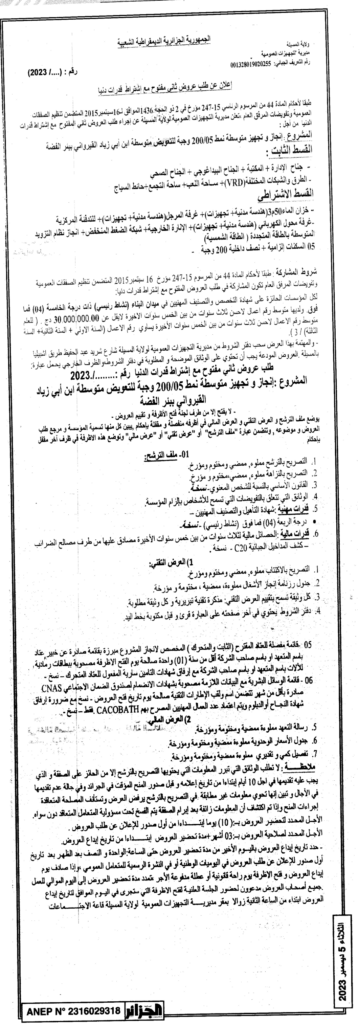إعلان عن طلب عروض ثاني مفتوح: انجاز وتجهيز متوسطة نمط 200/05 وجبة للتعويض متوسطة ابن ابي زياد القيروني ببئر الفضة/ مديرية التجهيزات العمومية لولاية المسيلة