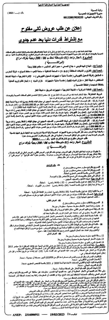 طلب عروض مفتوح مع اشتراط قدرات دنيا من أجل المشروع: انجاز واحد (01) متوسطة نمط ب 200/06 وجبة بأولاد دراج (البراكتية)19 مارس، 20230 13 شاركها فيسبوك X مشاركة عبر البريد طباعة